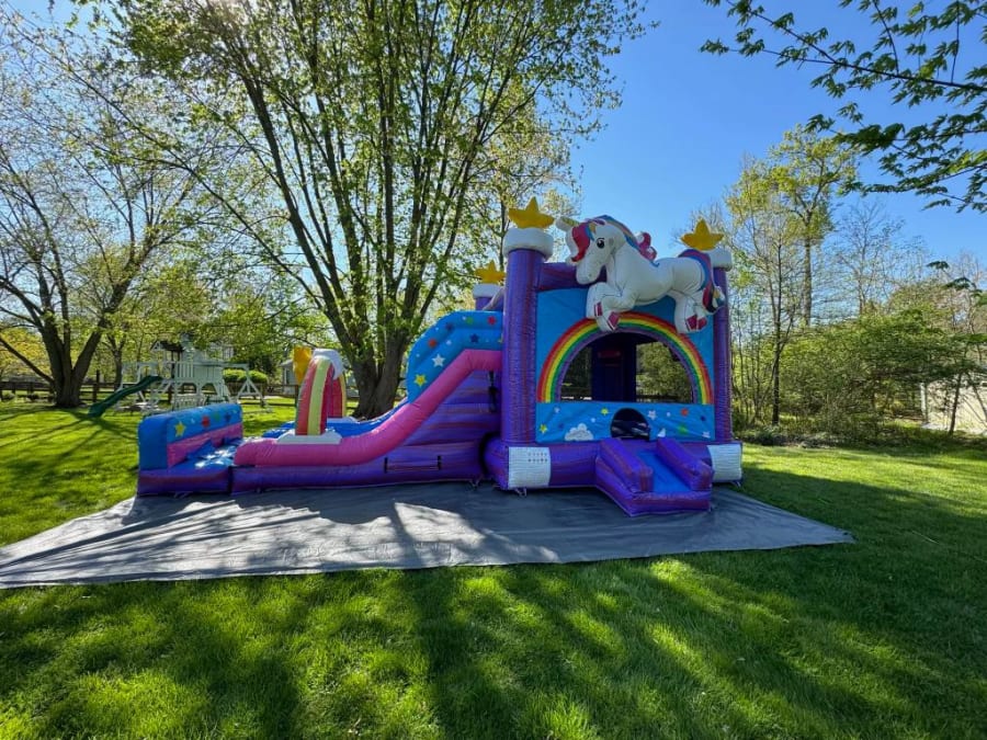 Introducing our enchanting Combo Unicorn, a magical addition to any celebration! This inflatable marvel features not just one, but two exhilarating slides alongside a spacious bounce house, ensuring endless fun for all. With dimensions of 15 feet in width, 35 feet in length, and standing tall at 17 feet, it's perfect for accommodating a joyful gathering. Let the vibrant colors and whimsical unicorn theme transform your event into an unforgettable adventure. Ideal for birthdays, festivals, and more, the Combo Unicorn promises to delight guests of all ages with its mystical charm and exciting activities.