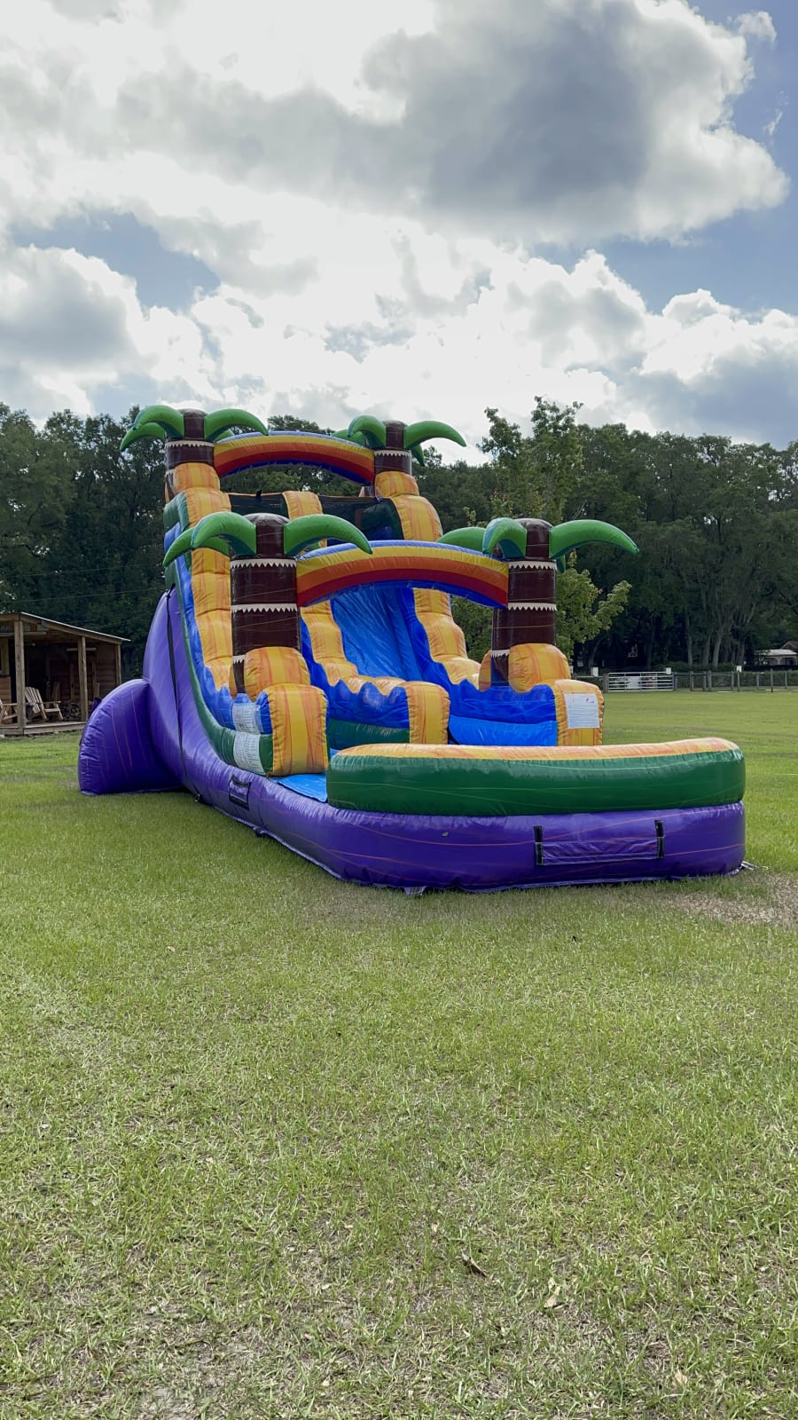 Goombay will bring the vacation to your back yard! The word Goombay originated from the drum and music traditionally played on the Bahamas. You add that and include the color scheme purple, green, blue and yellow with 3D palm trees, you'll be vacationing at the Bahama islands in your next event. The inflatable slide is ready for rental and equipped for wet and dry fun. Our slides are sanitized before and after ALL events assuring customer satisfaction.